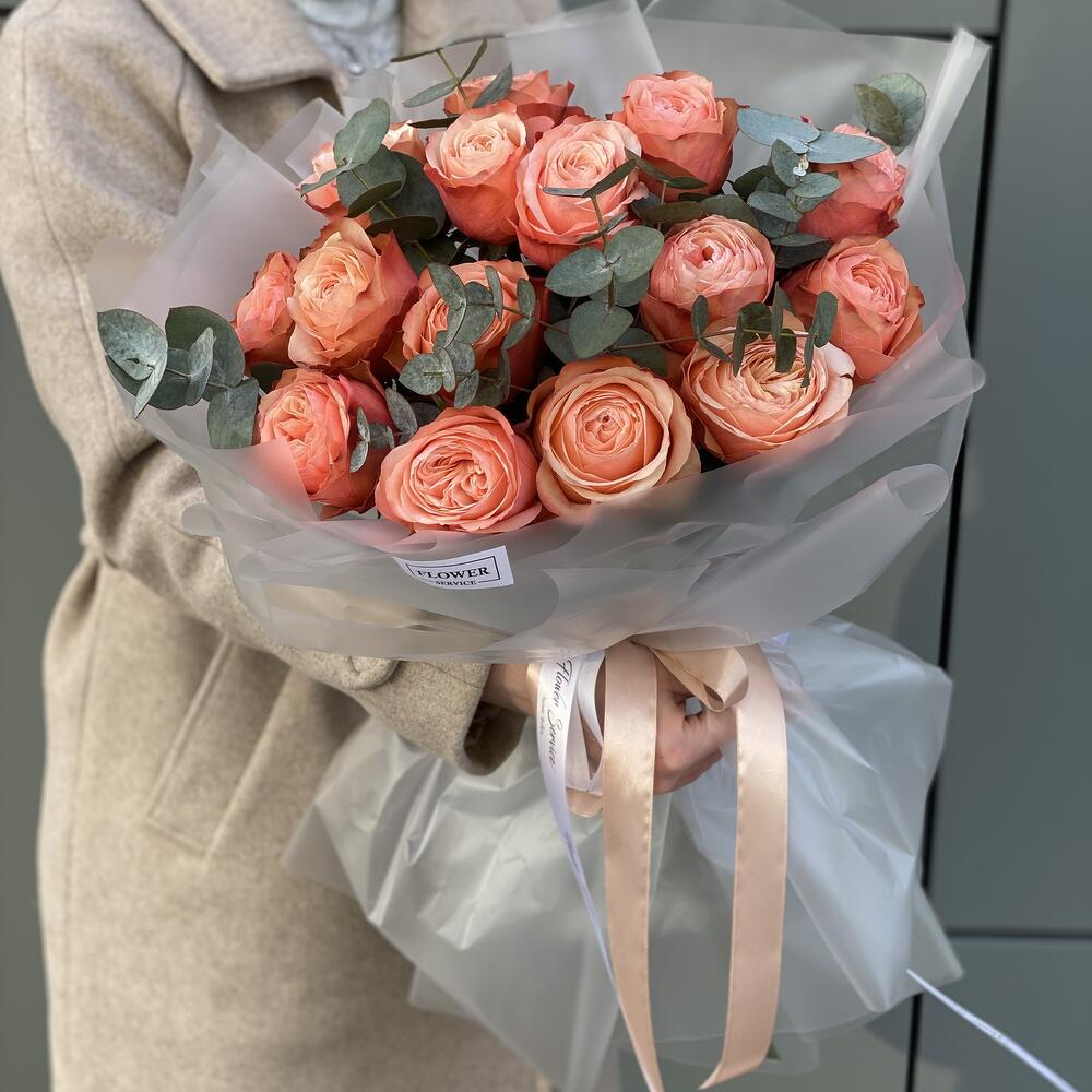 Букет из 15 роз сорта кахала и эвкалипта в Дзержинском